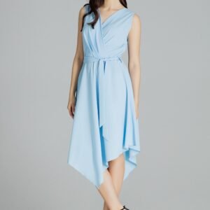 Niebieska lekka zwiewna sukienka midi bez rękawów. Kopertowy dekolt, przeszyta w pasie z ozdobnym wiązanym paskiem. Rozkloszowany asymetryczny dół sukienki. Zapinana z lewej strony na kryty zamek.
