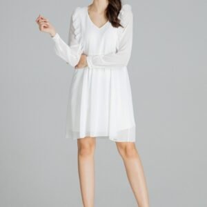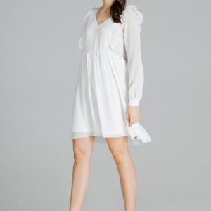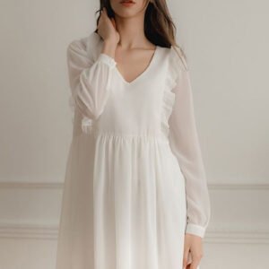 Luźna zwiewna szyfonowa sukienka midi z długim marszczonym rękawem z mankietem, zapinanym na guzik. Dekolt w serek. Z przodu i z tyłu wszyte ozdobne pionowe falbany. Marszczona w pasie. Bez zapięcia. Dół sukienki z halką.