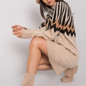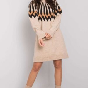 Dzianinowa sukienka z długim rękawem, oraz golfem. Sukienka ozdobiona geometrycznym wzorem. Idealna na co dzień i nie tylko.