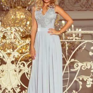 Srebrna długa suknia maxi z haftowanym dekoltem. Sukienka pięknie eksponuje dekolt i plecy. Produkt polski. Marka numoco.