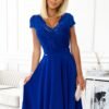 Ekskluzywna szyfonowa sukienka z krótkim rękawkiem, koronkowym dekoltem i wycięciem na plecach. Sukienka w kolorze butelkowanej zieleni. Produkcja polska. Marka Numoco.