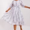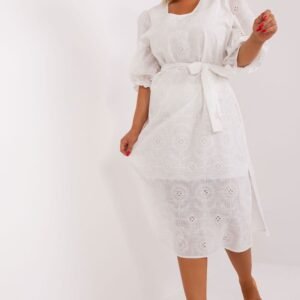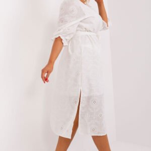 Bawełniana sukienka plus size z rękawem 3/4 oraz okrągłym dekoltem. Sukienka posiada podszewkę, w pasie wiązanie. Sukienka wykonana z materiału z haftem. Propozycja na wiele okazji.