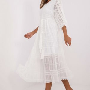 Rozkloszowana sukienka koktajlowa o długości midi, wykonana z bawełny z dodatkiem nylonu, zachwyca elegancją i subtelną strukturą materiału. Model z okrągłym dekoltem oraz rękawem 3/4 w modnym, bufiastym kroju, wykończonym delikatną falbanką, łączy klasykę z kobiecymi akcentami. Sukienka posiada podszewkę, co zwiększa komfort noszenia, oraz pasek do wiązania w talii, który pięknie podkreśla sylwetkę. Brak zapięcia sprawia, że jest wygodna w zakładaniu. Idealna propozycja na wizytowe okazje, przyjęcia i eleganckie spotkania.
