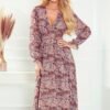 Śliczna i skromna bordowa sukienka z delikatnymi plisami na rękawkach i spódnicy. Marka numoco.