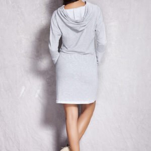 Dresowa sukienka o prosty kroju z długim rękawem. Sukienka posiada kaptur, w pasie ściągający sznurek. Rękawy i dół wykończone materiałem w nieco innym odcieniu. Na przodzie kieszonka typu kangurek.