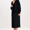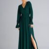 Koszulowa sukienka maxi z kołnierzykiem. Na linii biustu ozdobne patki. Długi rękaw wykończony mankietem zapinanym na guzik. Sukienka zapinana na guziki, wiązana w pasie. Rozcięcia po bokach. Sukienka bez kieszeni oraz podszewki.