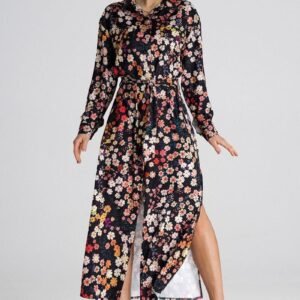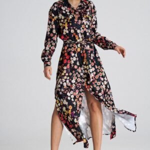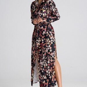 Koszulowa sukienka maxi z kołnierzykiem. Na linii biustu ozdobne patki. Długi rękaw wykończony mankietem zapinanym na guzik. Sukienka zapinana na guziki, wiązana w pasie. Rozcięcia po bokach. Sukienka bez kieszeni oraz podszewki.