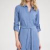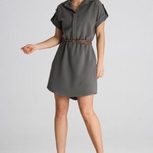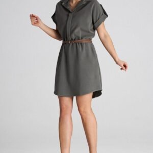 Sukienka o luźnym fasonie z kołnierzykiem oraz krótkimi rękawami zakończonymi mankietami. W szwach bocznych kieszenie wsuwane. W talii zapinany pasek.