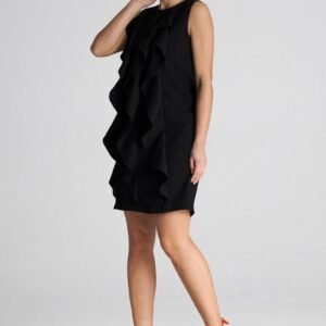 Sukienka trapezowa bez rękawów z pionowymi ozdobnymi falbanami na przodzie. Sukienka zapinana na kryty zamek.