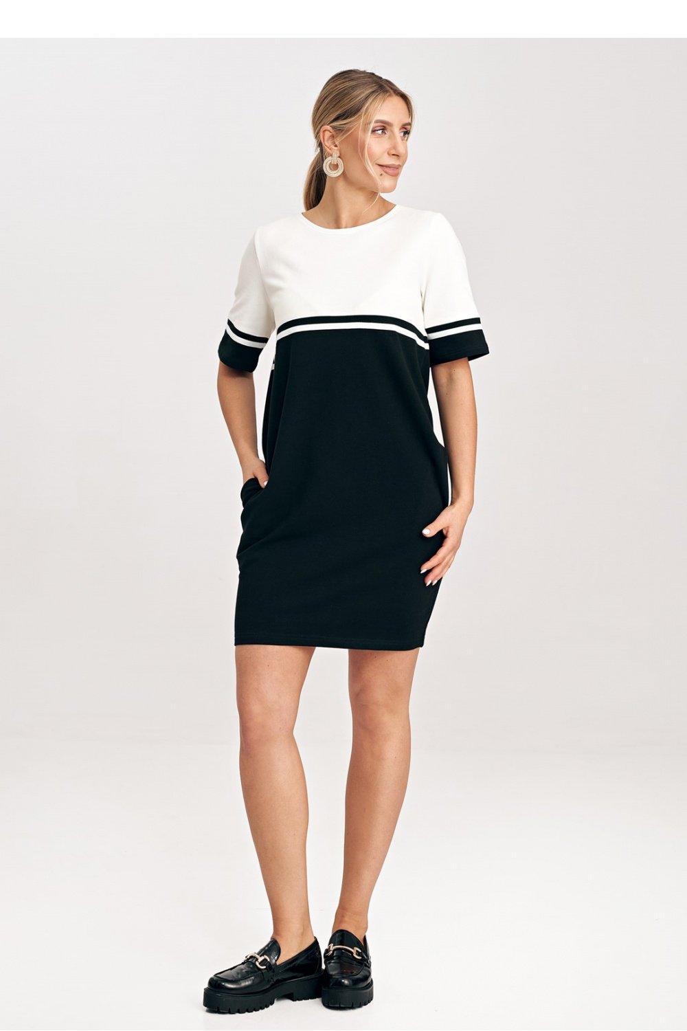 Wygodna, bawełniana sukienka mini z krótkim rękawem. Dwukolorowa z biegnącym przez środek paskiem. Posiada kieszenie w szwach bocznych. Idealna do noszenia do pracy i na co dzień.
