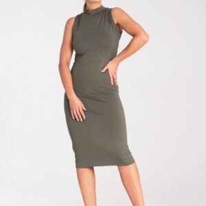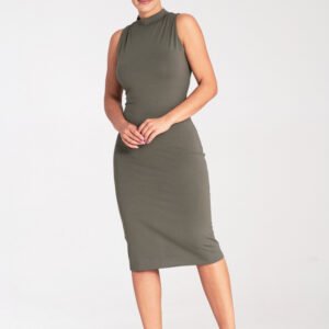 Dopasowana sukienka midi bez rękawów ze stójką. Zapinana z tyłu na kryty zamek.