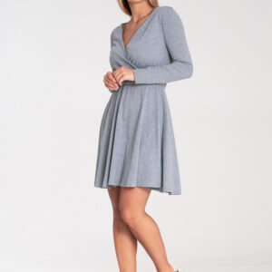 Bawełniana sukienka z długim rękawem oraz kopertowym dekoltem w serek. W pasie gumka. Dół sukienki rozkloszowany.