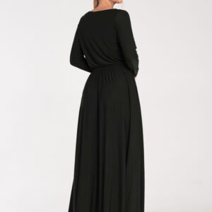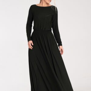 Prosta sukienka maxi z długim rękawem oraz dekoltem w łódkę. W pasie wszyta guma. Idealna propozycja na wiele okazji.