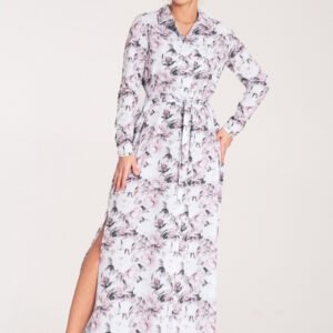Sukienka maxi zapinana na guziki. Sukienka z długim rękawem i kołnierzykiem. Uszyta ze zwiewnego materiału z rozcięciami po bokach. Wiązana w pasie wąskim paskiem.