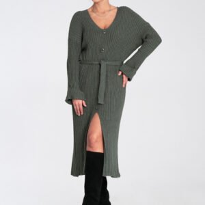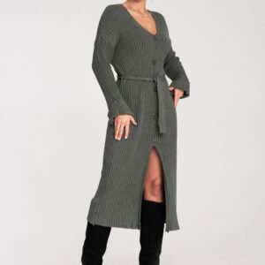 Dzianinowa sukienka midi o eleganckim, a zarazem komfortowym kroju. Z przodu ozdobiona dekoracyjnymi guzikami, które nadają jej wyjątkowego charakteru. Posiada długie, lekko rozkloszowane rękawy oraz dekolt w serek podkreślający kobiecy styl. Wiązanie w pasie akcentuje talię i pozwala na idealne dopasowanie.