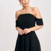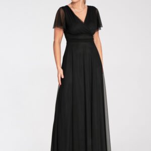 Sukienka midi z siatki z krótkimi rękawami typu motylek. Model z wszytymi miseczkami oraz dekoltem w serek. Dół rozkloszowany z podszewką. Pod biustem szerokie odcięcie podkreślające talię. Zapinana z tyłu na zamek.