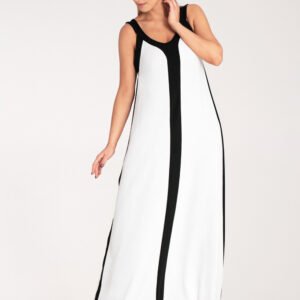 Sukienka maxi na ramiączkach w kontrastowym, czarno-białym wzorze optycznie wysmuklającym sylwetkę. Krój luźny. Klasyczny fason z dekoltem w kształcie litery V. Odpowiednia dla osób noszących rozmiary S, M, L oraz XL.