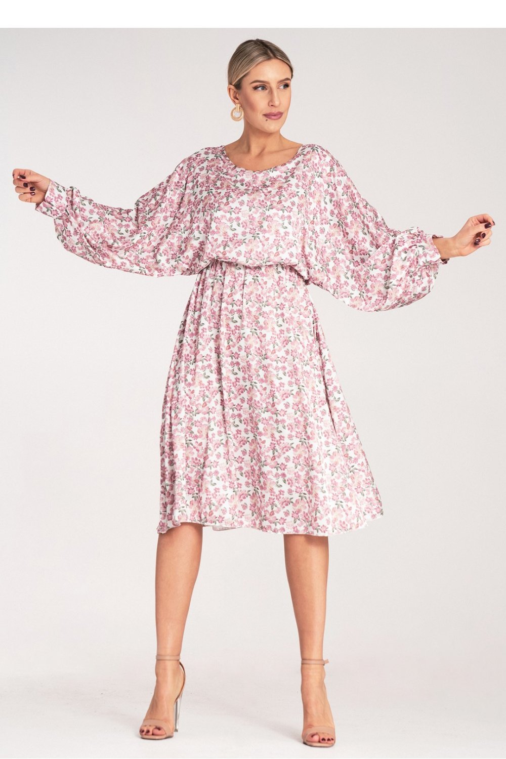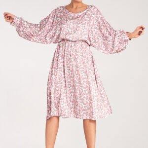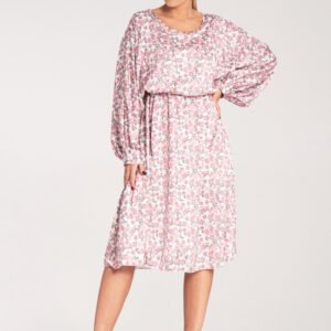Sukienka midi w kwiatowy wzór z wysokiej jakości satyny. Krój w stylu kimono. Sukienka z luźnymi rękawami zakończonymi mankietem. W talii niewielkie marszczenie.