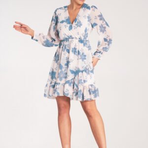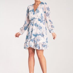 Zwiewna sukienka midi w kwiatowy wzór z zakładanym dekoltem i długimi rękawami zapinanymi na guziki. Elastyczna talia podkreśla sylwetkę.