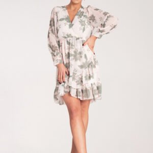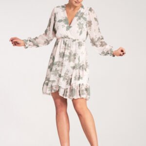 Zwiewna sukienka midi w kwiatowy wzór z zakładanym dekoltem i długimi rękawami zapinanymi na guziki. Elastyczna talia podkreśla sylwetkę.