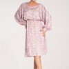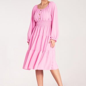 Sukienka midi, góra marszczona z dekoltem hiszpańskim. Ozdobiona drewnianymi guzikami i elastycznym pasem podkreślającym talię.