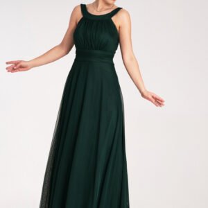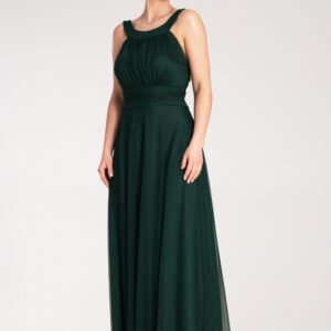 Elegancka sukienka maxi, wykonana z lekkiego, zwiewnego materiału. Góra subtelnie marszczona z szerokimi ramiączkami i zabudowanym dekoltem pod szyję. Model z taliowanym, marszczonym pasem.