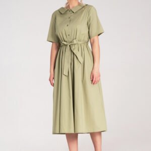 Sukienka o długości midi, wykonana z koszulówki. Góra z krótkim rękawem, zapięciem na guziki i półokrągłym kołnierzykiem o miękkiej linii. Sukienka z paskiem do wiązania z tego samego materiału. Dół rozkloszowany, z drobnymi zakładkami z tyłu, tworzy klasyczny fason w literę A.