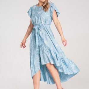 Sukienka midi wykonana z lekkiego materiału. Na całej powierzchni nadrukowany motyw kwiatowy z wypukłą, gumową fakturą. Góra z okrągłym dekoltem, falbanowymi rękawami i zapięciem na guzik z tyłu. W talii wiązany pasek z tego samego materiału. Dół sukienki asymetryczny z falbaną. Przód krótszy niż tył.