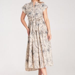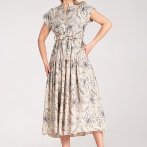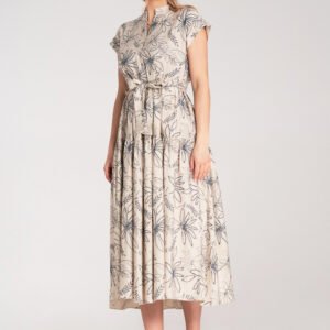 Sukienka midi z krótkim rękawem i stójką przy dekolcie.Góra zapinana na guziki. Na całej powierzchni nadrukowany biały, wypukły motyw kwiatowy o gumowej strukturze. W talii cienki pasek do wiązania z tego samego materiału, u dołu szeroka falbana dodająca objętości.