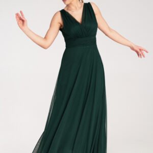Sukienka maxi bez rękawów z kopertowym dekoltem z przodu i głębokim wycięciem na plecach. Góra delikatnie marszczona, z szerokim pasem pod biustem. Tył wiązany w kokardę.