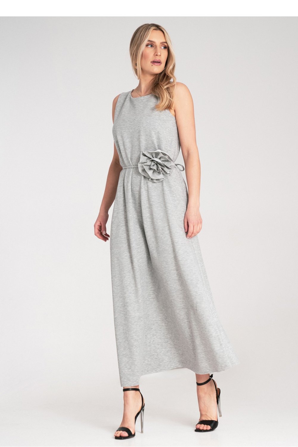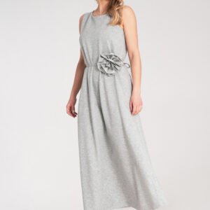 Sukienka maxi bez rękawów, z zaokrąglonym dekoltem oraz prostą górą. W talii cienki pasek z ozdobnym kwiatem z tej samej tkaniny. Dół luźny, lekko rozszerzany, wykonany z gładkiej, miękko układającej się dzianiny.