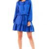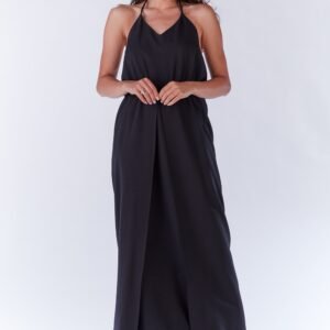 Prosta sukienka wiązana na szyi w kolorze czarnym. W talli wszyta gumka. Na przodzie zakładka z rozcięciem.