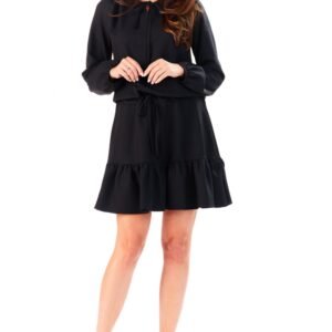 Sukienka z długim rękawem w kolorze czarnym. U dołu ozdobna falbanka. Przy dekolcie i w talii ozdobne wiązanie.