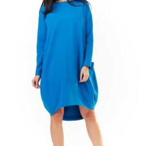 Dresowa sukienka o luźnym kroju, z przedłużanym tyłem. Sukienka z dużymi kieszeniami po bokach. Idealna na co dzień i nie tylko.