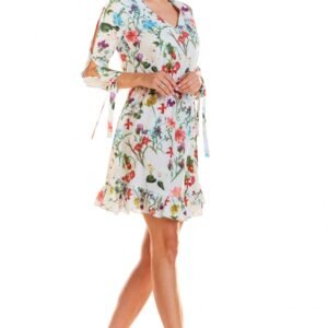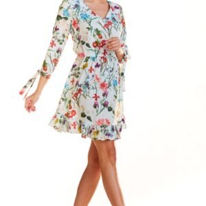 Sukienka z rękawem 3/4, dół lekko rozkloszowany z falbanką. Rękawy z ozdobnym wiązaniem. Idealna na wiele okazji.