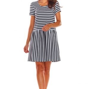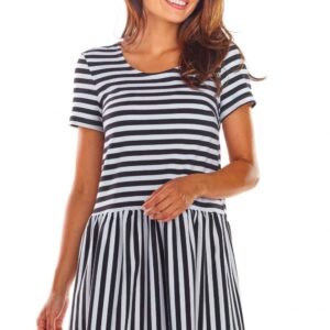 Mini sukienka w czarne lub beżowe paski, z krótkimi rękawami. Idealna w połączeniu z dżinsową kurtką.
