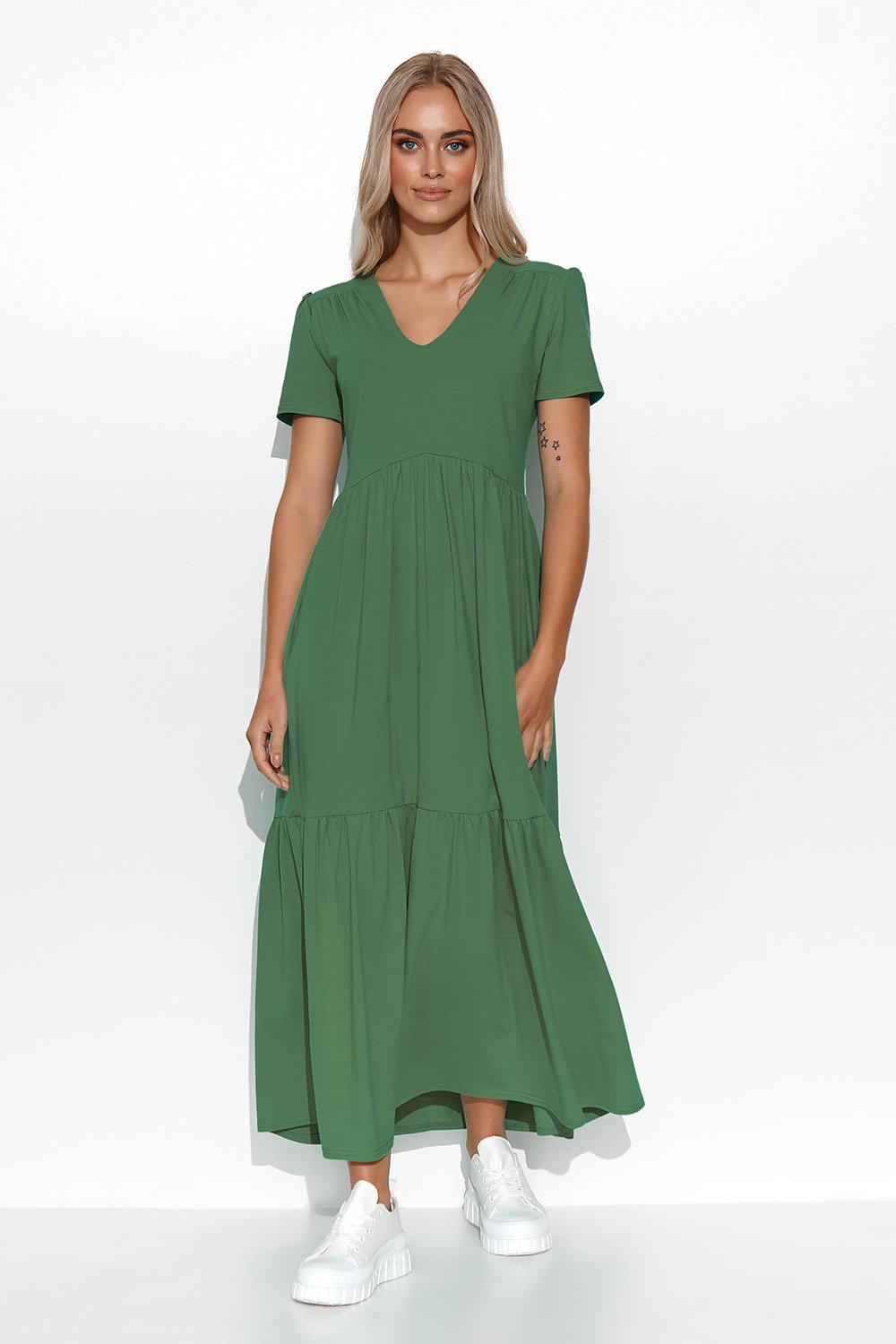 Sukienki to niewątpliwie jedne z najbardziej kobiecych części damskiej garderoby. Nic dziwnego, to właśnie one dodają powabu i dziewczęcego czaru. Sukienka maxi dzianinowa uszyta została w bardzo klasycznym fasonie, który z niemal każdej kobiety czyni klepsydrę. Wygodna dzianina zapewnia uczucie swobody, krótki rękaw zakrywa ramiona w ich najszerszych obszarach. Dekolt typu v-neck wydłuża szyję, z kolei obszycie w okolicach talii, podkreśla najszczuplejszy obszar kobiecej sylwetki, dodając lekkości. Lekkie falbany, umiejscowione w kilku miejscach na całej długości sukienki, dodadzą romantycznego charakteru każdej stylizacji z tą kreacją w roli głównej. Maxi sukienka w jednolitym kolorze nie potrzebuje wielu dodatków, chociaż także chętnie przyjmie wiele z nich. Na sportowo, z ulubioną nerką i tenisówkami lub elegancko, ze szpilkami i kopertówką.