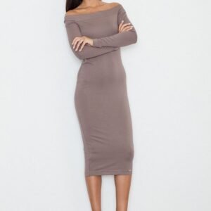 Dopasowana sukienka długości za kolano, odsłaniająca ramiona, bez kieszeni. Idealna na wieczorne wyjście.