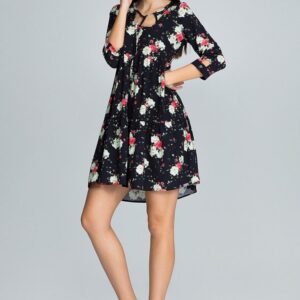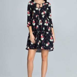 Trapezowa sukienka z dwoma falbanami wiązana pod szyją z rękawem 3/4. Luźna forma sukienki podkreśla uniwersalizm noszenia. Szczególnie dla kobiet chcących ukryć niedoskonałości figury.
