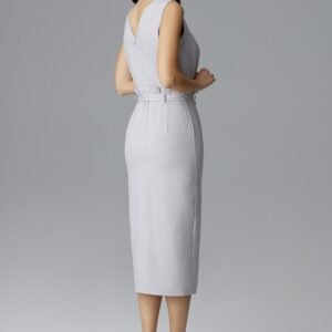 Dopasowana sukienka bez rękawów, dekolt z przodu i z tyłu w serek. W pasie falbana z paskiem, z przodu pęknięcie dodaje szyku i elegancji.