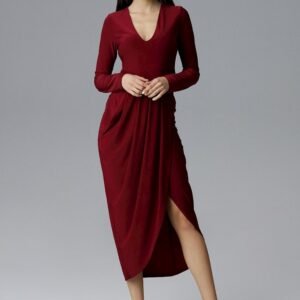 Elegancka długa sukienka z dekoltem w serek. Przód zakładany, asymetryczny z rozcięciem od uda. Model z długim rękawem. Pięknie podkreśli figurę.