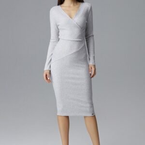 Dopasowana sukienka z długim rękawem z dobrej jakości tkaniny. Model z dekoltem w serek i gumką w pasie.