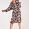 Delikatna sukienka za kolano z okrągłym dekoltem. Luźny rękaw reglanowy dodaje komfortu i swobody. Fason z gumką w pasie i niewielkim przewiązaniem nadaje elegancji i modnego szyku.
