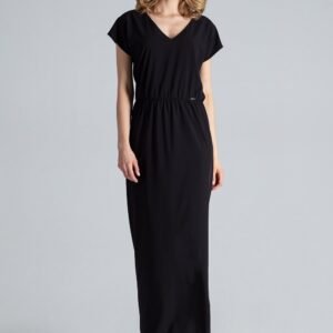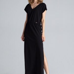 Długa, lekka i zwiewna sukienka z dekoltem w kształcie litery V z krótkim rękawem. Rozcięcie z lewej strony, w pasie wszyta gumka.
