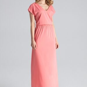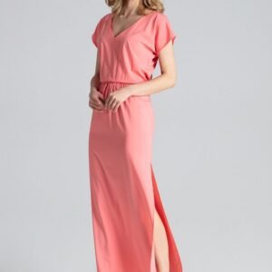 Długa, lekka i zwiewna sukienka z dekoltem w kształcie litery V z krótkim rękawem. Rozcięcie z lewej strony, w pasie wszyta gumka.