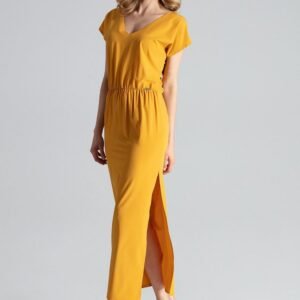 Długa, lekka i zwiewna sukienka z dekoltem w kształcie litery V z krótkim rękawem. Rozcięcie z lewej strony, w pasie wszyta gumka.