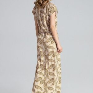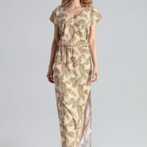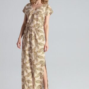 Długa, lekka i zwiewna sukienka z dekoltem w kształcie litery V z krótkim rękawem. Rozcięcie z lewej strony, w pasie wszyta gumka.