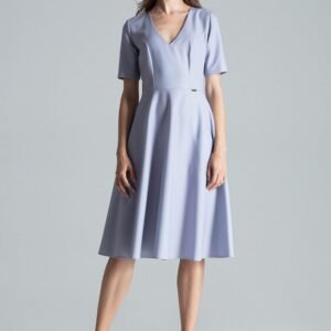 Szara sukienka midi z krótkim rękawem, bez podszewki, z dekoltem w serek. Sukienka odcięta w pasie, rozkloszowana. Z bocznymi kieszeniami w szwach. Zapinana z tyłu na zamek.