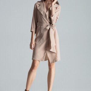 Luźna beżowa koszulowa sukienka bez zapięcia wiązana w pasie. Sukienka z kołnierzykiem, bez kieszeni oraz podszewki.