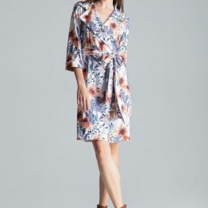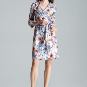 Luźna koszulowa sukienka we wzory, bez zapięcia wiązana w pasie. Sukienka z kołnierzykiem, bez kieszeni oraz podszewki.